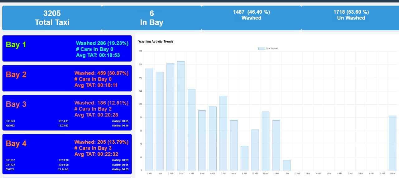 This intelligent system uses RFID-based vehicle identification to automatically log cars as they enter and exit the wash bay, eliminating manual data entry and reducing errors. Real-time monitoring provides complete visibility into the number of vehicles in each bay, waiting times, and average turnaround time (TAT), helping businesses improve efficiency. Automated service logging keeps a digital record of washed and unwashed vehicles, ensuring accurate reporting and service transparency. Additionally, the system optimizes workforce allocation by distributing staff based on workload, balancing operations across multiple washing bays.